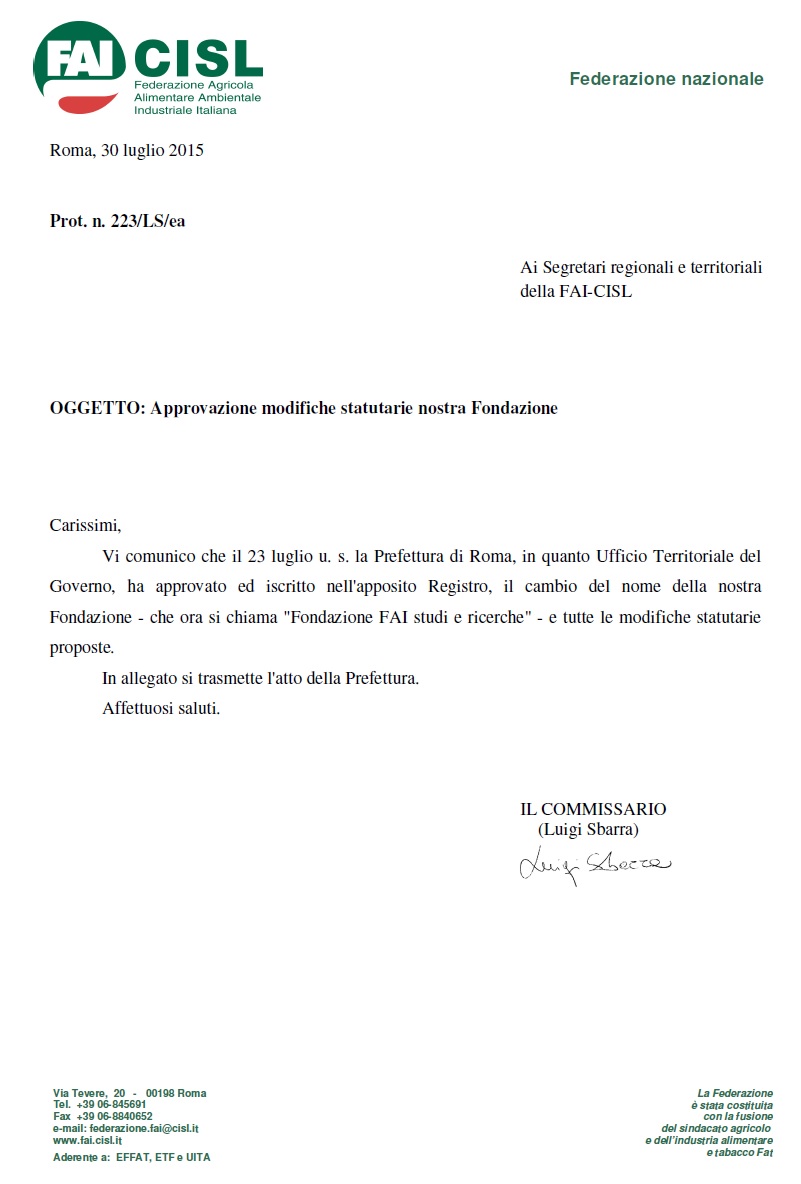 La fretta di dare l’annuncio ha però tradito il commissario: un po’ perché neanche stavolta è riuscito a scrivere esattamente il nome completo della sua fondazione (che, come risulta dalla lettera allegata si chama “Fondazione FAI CISL Studi e ricerche“); un po’ perché parlare di approvazione di “tutte le modifiche proposte” è affermazione che, in attesa di averne piena conoscenza, suona un po’ equivoca.