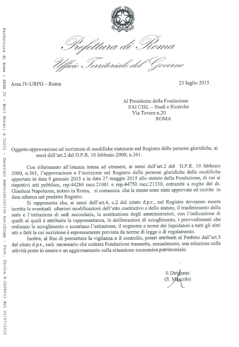 Mentre la fondazione usa già, senza averne diritto, il nuovo nome, le modifiche proposte vengono respinte. Riproduciamo qui di seguito la lettera del dirigente responsabile del procedimento, il vice prefetto Serafina Mascolo (la trovate anche a questo link), che comunica di non poter accettare le modifiche a causa della soppressione del collegio dei revisori. Questa lettera, a quanto ci risulta, non viene diffusa dal commissario.