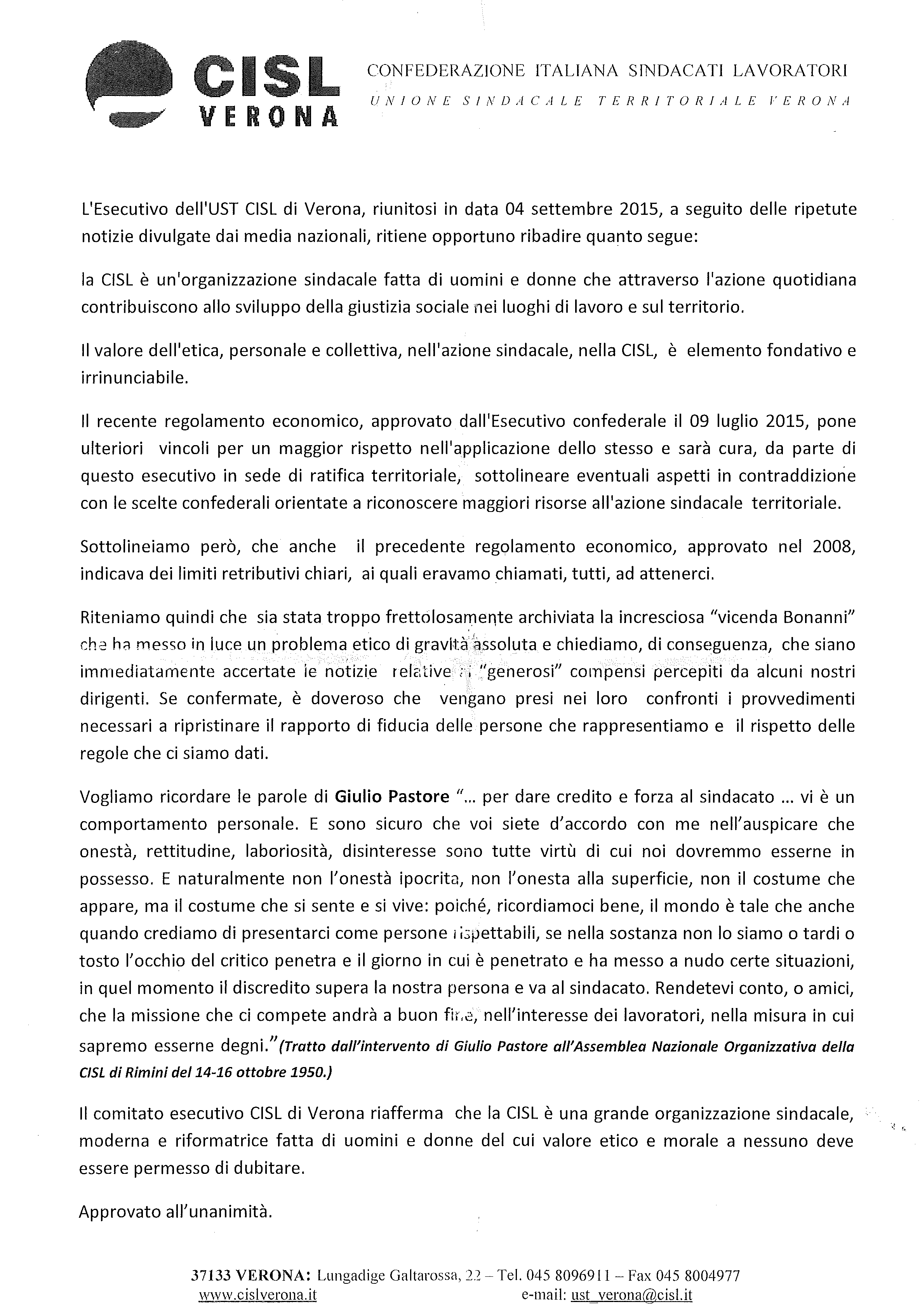 Così la Ust di Verona (la città di Giulietta, di Romeo e di Scandola), anziché unirsi al coretto del “grazie Furlan che ci prometti la trasparenza”, ricorda che il regolamento della Cisl già indica da anni “limiti retributivi chiari”, lamenta la “frettolosa archiviazione” della vicenda Bonanni, e chiede che sia fatta chiarezza “immediatamente” (qualcosa di più stringente del “subito” di Franca Porto) su eventuali “generosi compensi” ai dirigenti attuali.