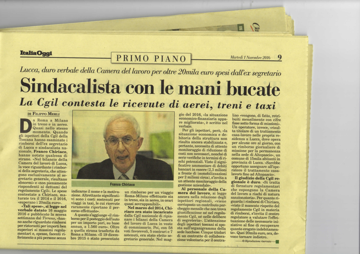 Il suo mandato è comunque breve, perché nella primavera scorsa Chiriaco, che è pensionato dal 2009 (e anche questa è una cosa mai successa nella Cisl) lascia il posto di segretario di Lucca. Ma la transizione non è pacifica: la sua gestione viene fatta oggetto di un’ispezione interna, i suoi rimborsi spese sono passati al setaccio e gli vengono contestate spese non giustificate. E anche questo nella Cisl non è possibile che accada perché da noi c’è il codice etico.